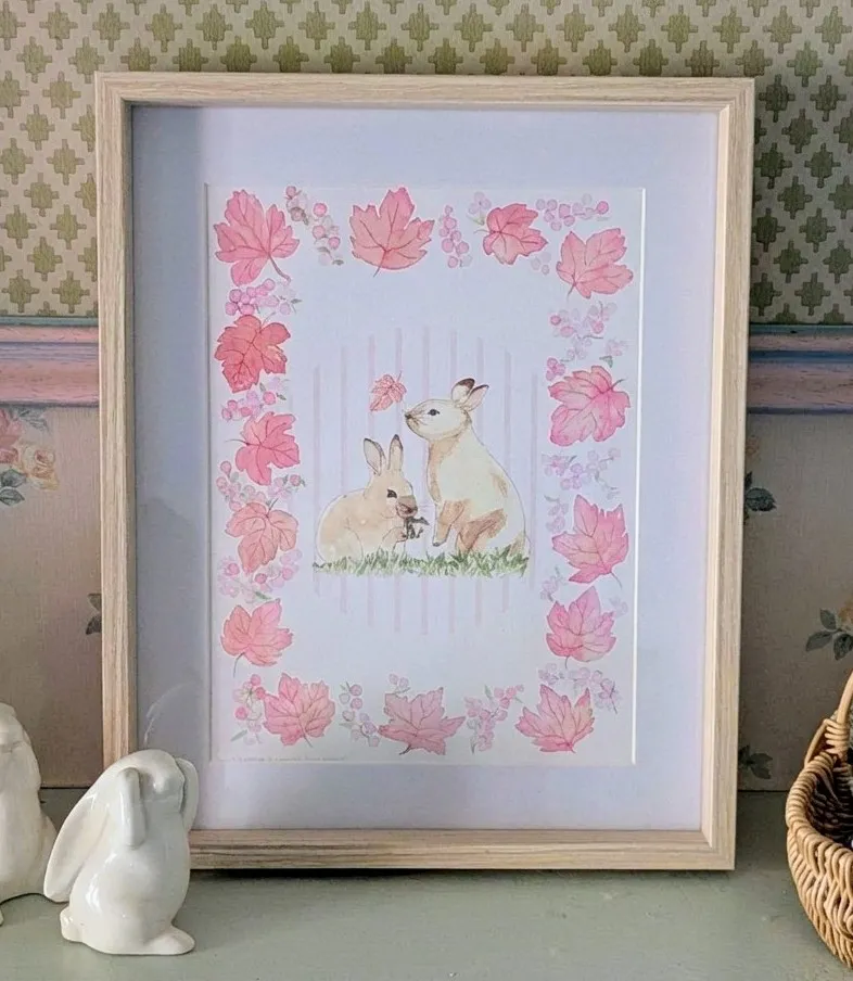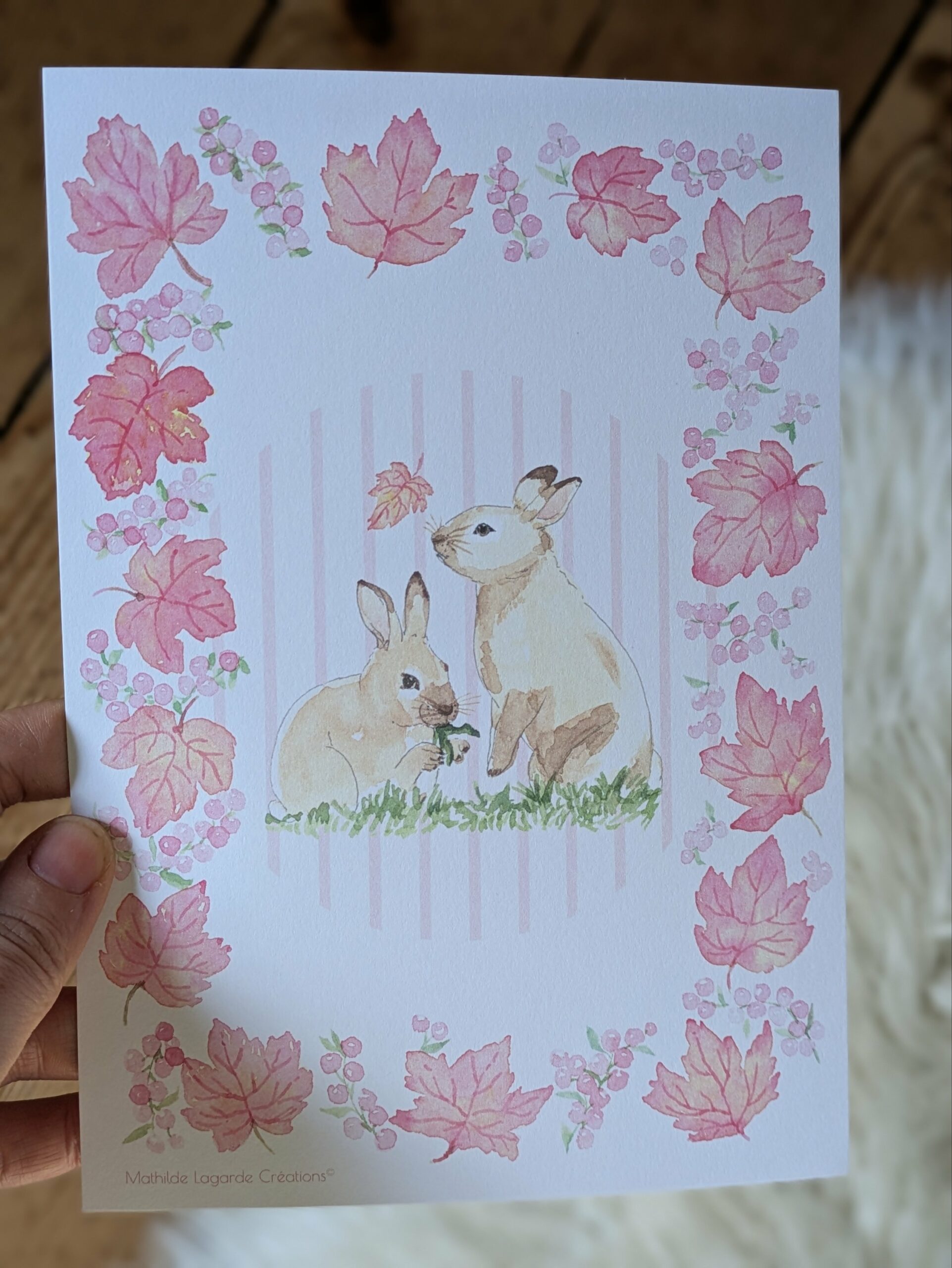 Affiche de petits lapins entourés de feuillages et de baies roses, peinte à l'aquarelle et reproduite sur format A5