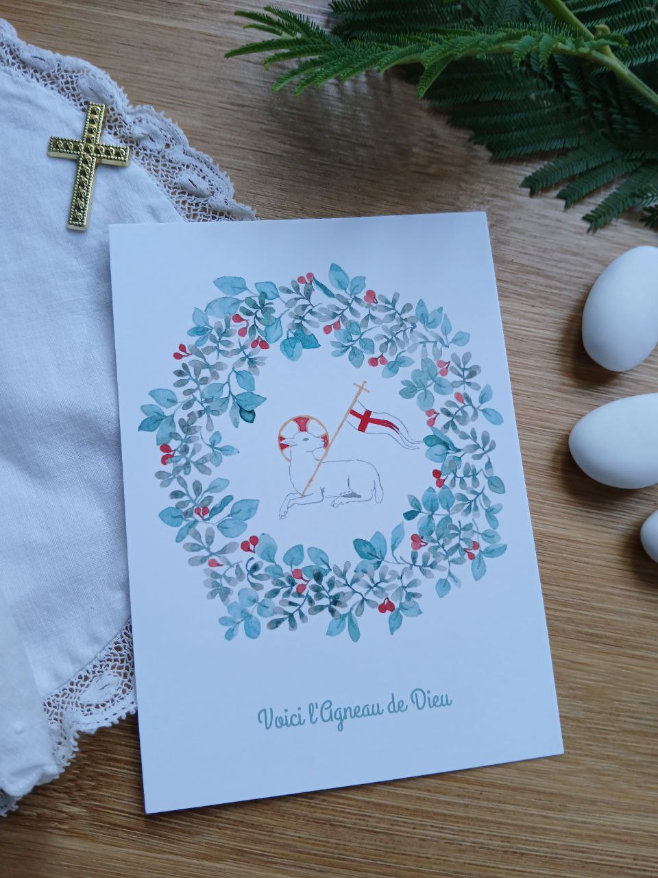 Image signet première communion garçon « Voici l’Agneau de Dieu » entouré d’une couronne florale hivernale. L’agneau portant l’étendard de la croix, symbole du Christ victorieux sur les ténèbres, doux et humble qui s’est donné à nous pour nous sauver. Cet Agneau, c’est le Christ, notre Sauveur, représenté dans Sa pureté et Son sacrifice rédempteur.